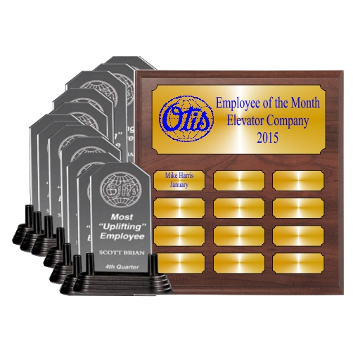 Our most economical EOM package is a great tool to motivate your employees. Designed for employee of month programs the perpetual plaque has 12 plates. This package includes 12 3x5 individual acrylics that will be given to the winner each month. Each month we mail you the new engraved plate and acrylic. These plaques and acrylics are great for all needs.